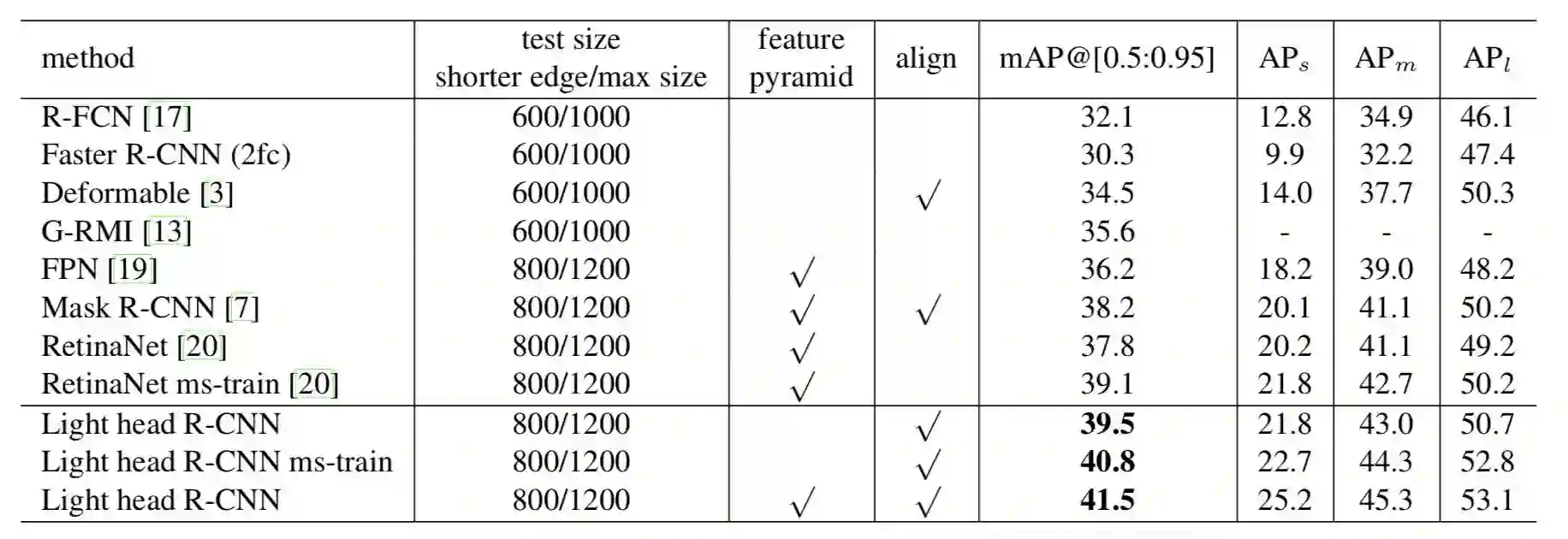 表 5. 不同大小的单个模型在 COCO test-dev 上的对比。所有实验都使用 Resnet-101 作为基础特征提取器(除了 R-RMI 使用的是 Inception Resnet V2 [33])。Light-Head R-CNN 达到了最好的准确率,且超过之间的最优准确率。注意: test-dev 的结果与 mini-validation 上的结果有些微不同。「ms-train」代表多尺度训练。