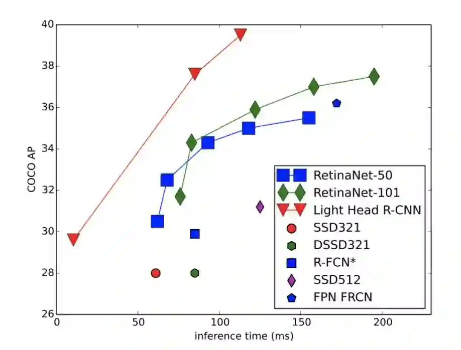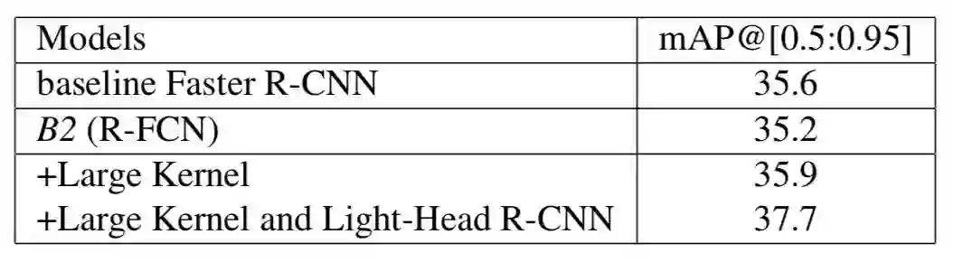 我们提出了一种新的两步检测器 Light-Head R-CNN,用于克服当前两步方法的缺陷。在我们的设计中,通过使用一个稀疏的特征图和一个廉价的 R-CNN 子网络(池化和单全连接层),我们把网络的头部尽可能轻量化。我们基于 ResNet-101 的 Light-Head R-CNN 在 COCO 数据集上的性能超过当前最佳的目标检测器,同时保证时间效率。更重要的是,通过简单地用一个小型网络(如 Xception)替换主干网络,Light-Head R-CNN 在 COCO 数据集上获得了 30.7 mmAP 和 102 FPS 的结果,在速度和准确率上显著优于快速的一步检测器(如 YOLO 和 SSD)。模型代码稍后公布。