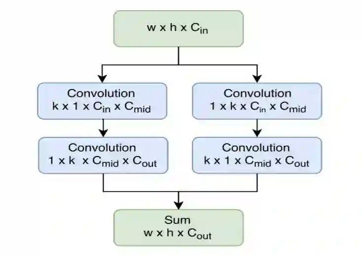 图 3. 大型可分卷积按顺序执行 k × 1 和 1 × k 卷积层。计算复杂度可以通过 C_mid 和 C_out 进一步进行控制。
