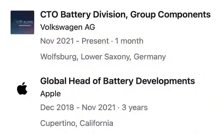 苹果全球电池研发主管跳槽大众,任电池部门CTO