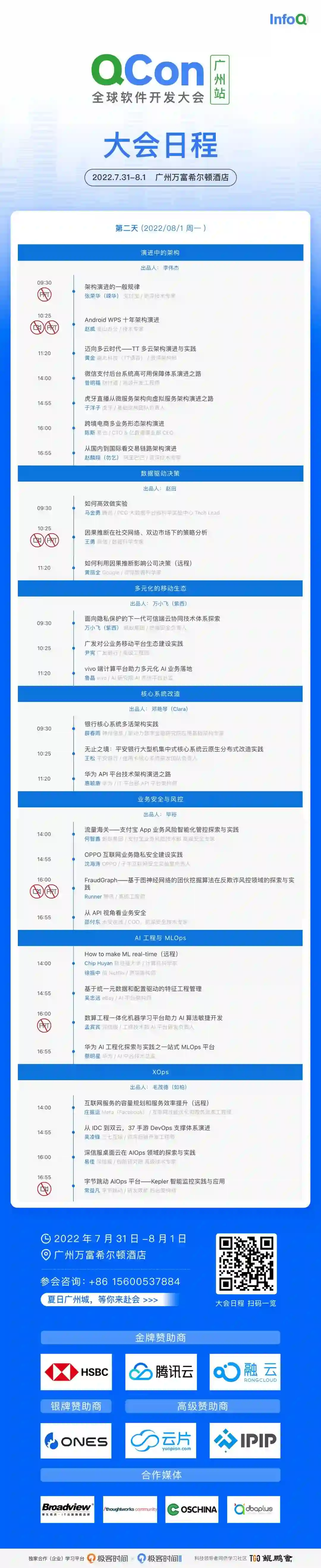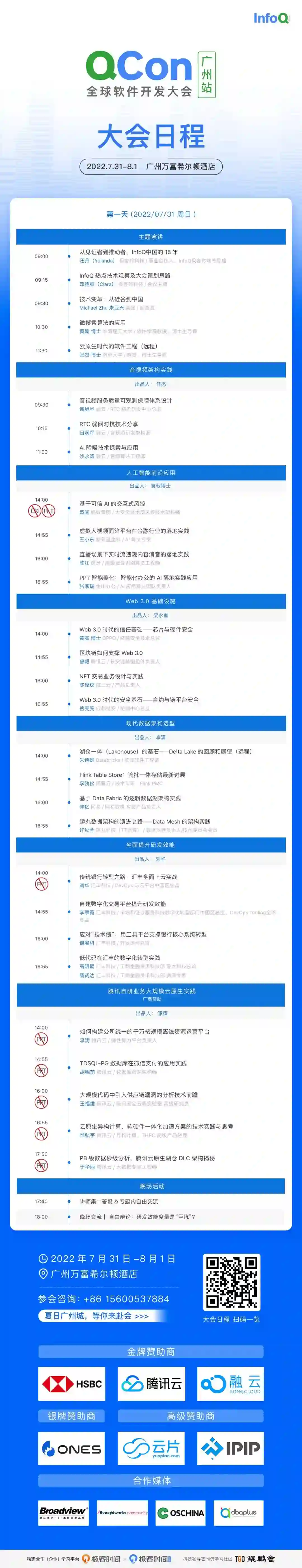 大会为期 2 天,邀请到 10 位专题出品人共同把控大会的内容。作为综合型大会,QCon 广州站设置了包括“Web 3.0 基础设施”、“人工智能前沿应用”、“业务安全与风控”、“演进中的架构”、“XOps”、“多元化的移动生态”等在内的 14 个技术专题。50+ 来自阿里巴巴、腾讯、汇丰科技、华为、字节跳动、eBay 等一线大厂的演讲嘉宾,来自平安、神州数码、虎牙、OPPO、vivo、深信服、TT 语音、金山办公等独角兽企业的资深专家,将在现场分享最新技术创新和实践,为你带来一场华丽丽的技术之旅。