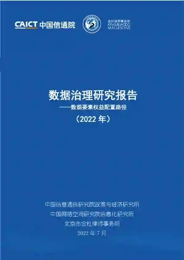 2022年7月15日,在中国信息通信研究院主办的“第三届数据治理研讨会”上,中国信通院政策与经济研究所、中国网络空间研究院信息化研究所、北京市金杜律师事务所联合撰写的《数据治理研究报告——数据要素权益配置路径(2022年)》正式发布。