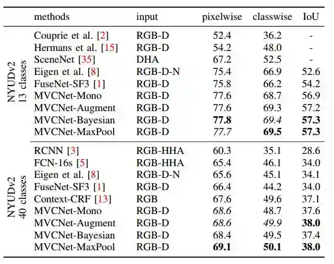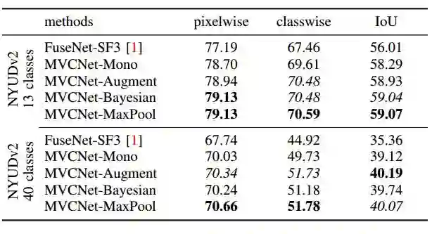 我们在NYUDv2数据集上进行了评估. 该数据集含有1449像素化标记的室内RGB-D图像, 并使用了795帧训练, 654帧测试.