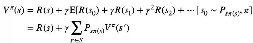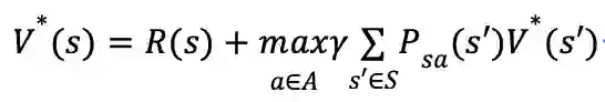 上面的等式称作贝尔曼方程(Bellman equation),从贝尔曼方程可以看出,当前状态的回报的期望包括两部分:1)当前状态的立即回报,2)后续状态的回报的期望和与折扣因子之积。