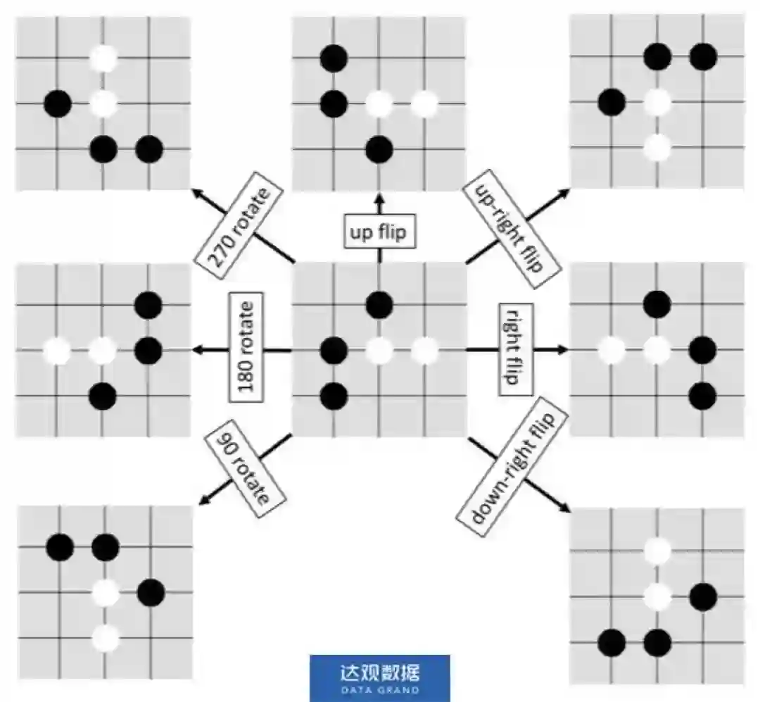 棋盘有 7 种不重复的旋/翻转变换,分别是:上(下)翻转,右(左)翻转,右上(左下)翻转,右下(左上)翻转,90度旋转,180度旋转,270度旋转。90度旋转可以通过右下翻转+上翻转来实现,180度旋转可以通过上翻转+右翻转来实现,270度旋转可以通过右下翻转+右翻转来实现,因此,只需要实现4个基础的翻转变换。在估计叶节点的值函数和各条边的先验概率时,从8种变换中随机地取一个对叶节点进行处理,并对策略网络的输出做相应的反变换。