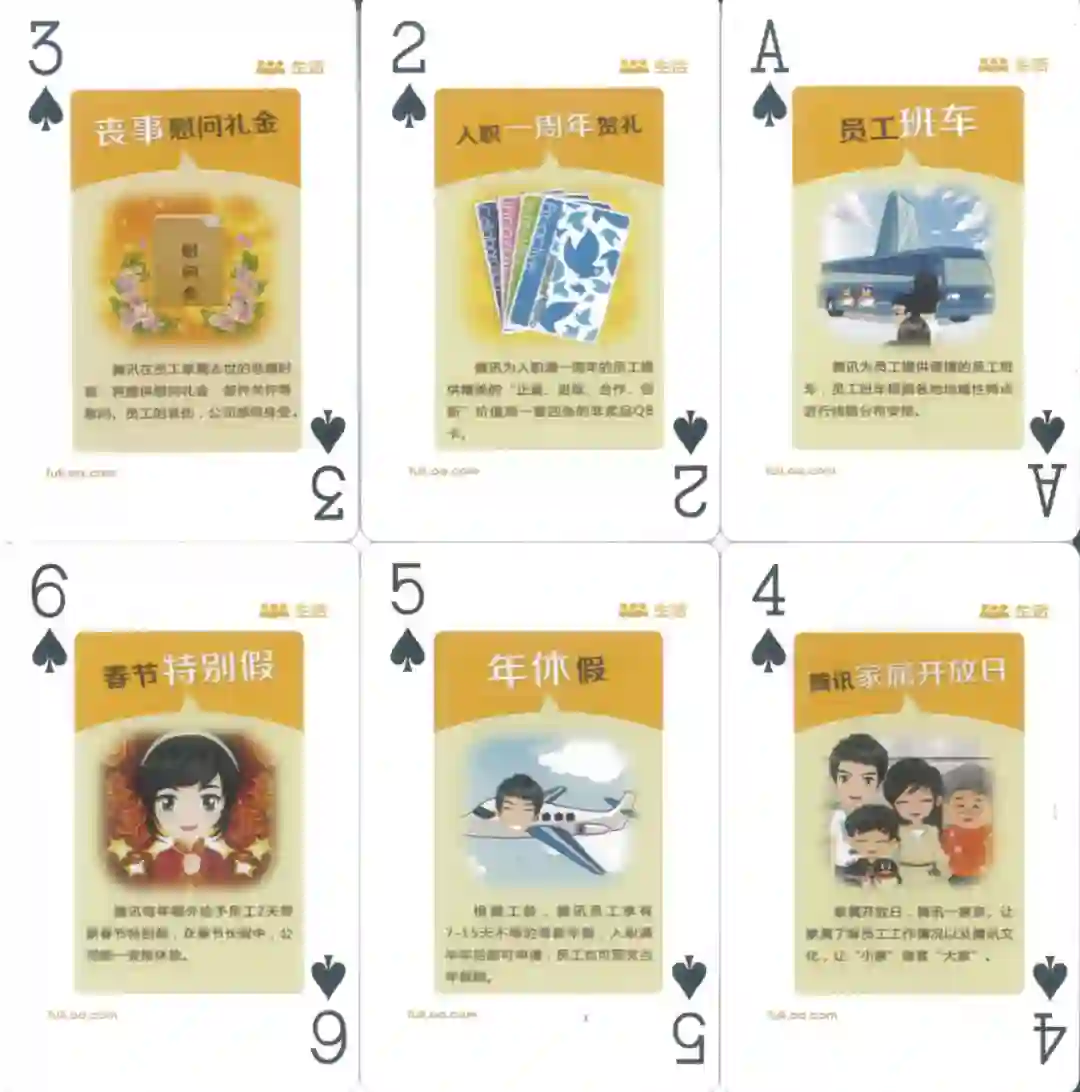 每一位入职腾讯新员工都能收到一副「福利扑克」,54张牌,每一张代表一种福利。