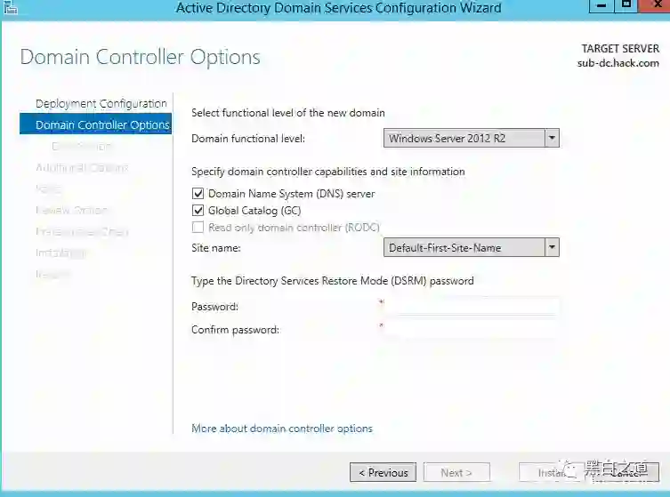 A域与CA域是”within forest“ 关系,内部信任是可以传递,这里子域的信任搭建很简单,就不细说了,说一下子域的加入,在CA域的域控搭建完后,选择加入一个存在的域,然后其中有个DSRM 密码: