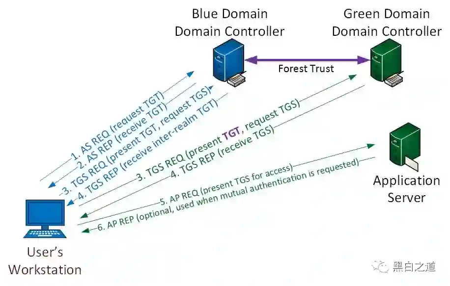 在两个域互相信任过后,会有一个信任密码及在每个域中注册一个ticket-granting 服务,用来提供跨域的服务。在上图可以看见蓝色的第4步,得到inter-realm(由域之间信任密码生成)的加密和签名的TGT,向另一个域DC请求TGS,绿色域DC使用信任密码验证通过后,生成了客户端要访问的绿色应用服务器的TGS票据。