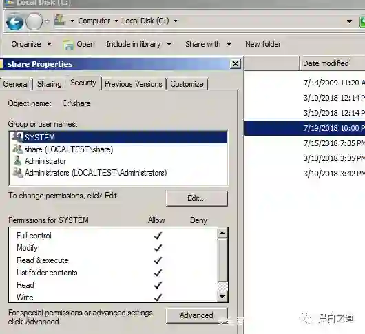 5.在B域的DC的C盘中建立一个share的分享文件夹,把share组的权限添加到当中。