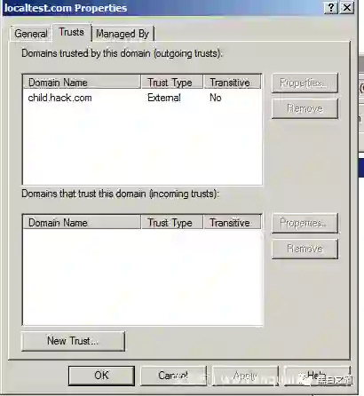 拥有多个域的大多数组织都需要用户访问位于不同域中的共享资源,并且信任允许具有多个域的组织授予不同域中的用户访问共享资源的权限。域林是相互信任的域容器的集合。森林本身也可能在它们之间有信任。内部信任具有传递关系,A信任B,B信任C,所以A也是信任C的,但是外部信任不能传递。