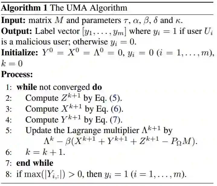 理论上,本研究证明了低秩评价矩阵 X 和稀疏矩阵 Y 可以在一些经典的矩阵补全假设下恢复。本研究提出了无组织恶意攻击检测算法(UMA),可以看作是一种近似交替分裂增广拉格朗日(proximal alternating splitting augmented Lagrangian)方法。研究者开发了一些新技术,证明该方法在全局收敛的最糟糕的情况下也具有 O(1/t) 的收敛速度。实验结果证明了该算法的有效性,且优于当前最优的攻击检测方法。