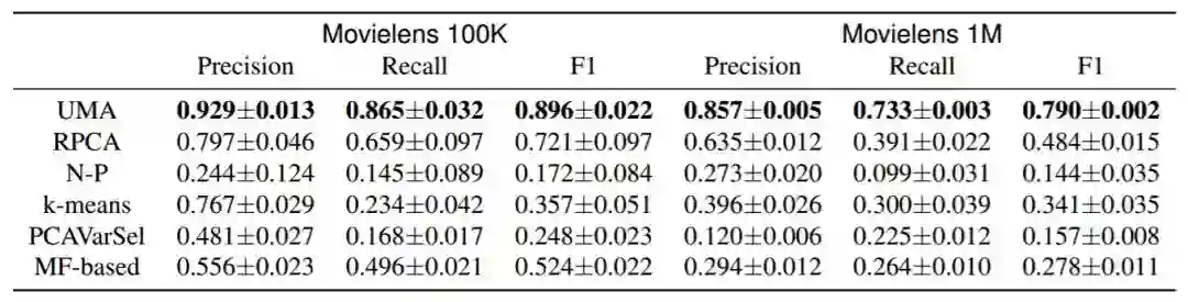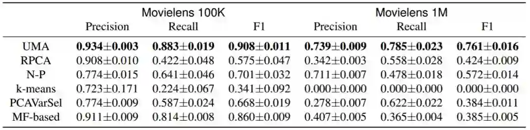表 1:在结合了传统策略的无组织恶意攻击下,UMA 与其他算法在数据集 MovieLens 100K 和 MovieLens 1M 上的检测查准率、查全率以及 F1 得分对比。