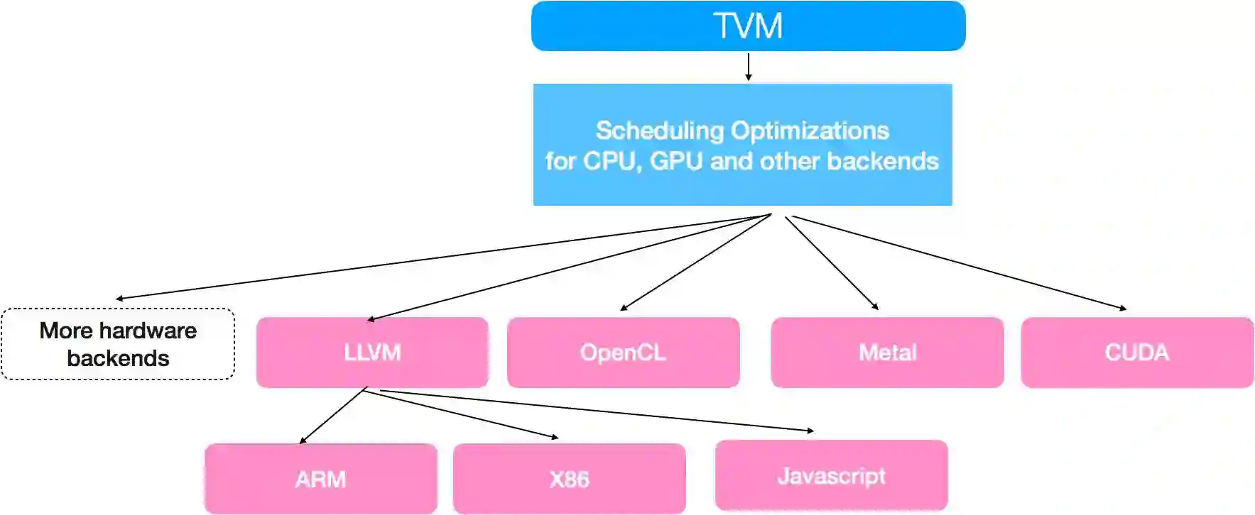 有了 TVM 的帮助,只需少量额外工作我们即可轻易地在手机端、嵌入式设备甚至浏览器上运行深度学习任务。TVM 还为多硬件平台上的深度学习工作负载提供了统一的优化框架,其中包括依赖全新计算原语的专用加速器。