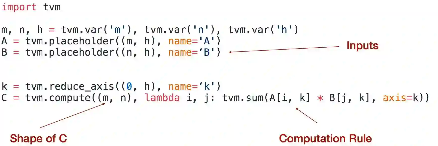 然而,我们发现只基于 IR 的计算图并不足以应对支持不同硬件后端的挑战。原因是像卷积或矩阵乘法一样的图运算符可以非常不同的方式映射和优化每个硬件后端。这些特定硬件的优化在内存布局、并行线程模式、缓存访问模式和硬件原语选择方面的变数可能很大。我们希望能够以通用表征的方式明确地表达这些优化旋钮(optimization knob),以有效地导航优化空间。