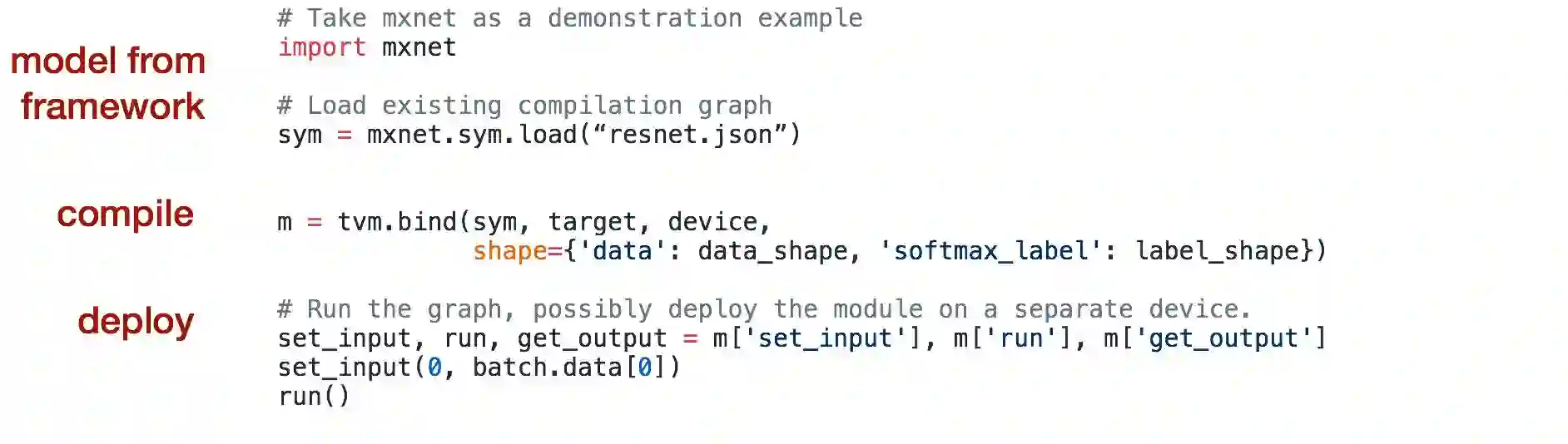 TVM 堆栈的目标在于提供一个可重复使用的工具链来将高级神经网络描述从深度学习框架前端向下编译为多硬件后端的低级机器代码。拿 Apache MXNet 作为前端的例子,以下代码段演示了如何使用 TVM 将深层学习模型的高级描述编译为针对目标硬件定制的优化可执行模块。