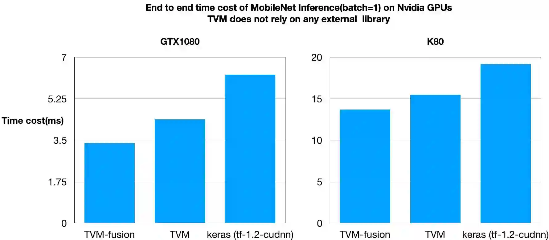 为了进行概念证明,我们构建了一种端到端编译管道,可以将 MXNet 模型编译成 TVM 执行图。我们通过自动融合运算符并使 TVM 生成融合的内核,在图形节点之间和之中应用优化。我们对 MobileNet 在 ImageNet 上的运行表现进行基准测试,结果如下: