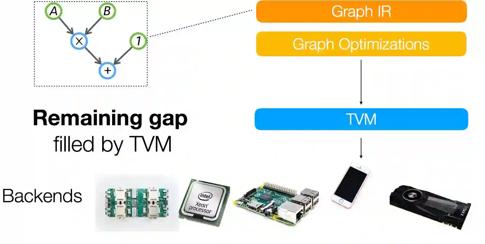 深度学习如今无处不在且必不可少。这次创新部分得益于可扩展的深度学习系统,比如 TensorFlow、MXNet、Caffe 和 PyTorch。大多数现有系统针对窄范围的服务器级 GPU 进行了优化,并且需要在其他平台(如手机、IoT 设备和专用加速器(FPGA、 ASIC))上部署大量工作。随着深度学习框架和硬件后端数量不断增加,我们提出了一个统一的中间表征(IR)堆栈,可以弥补以生产力为中心的深度学习框架与性能或效率导向的硬件后端之间的差距。