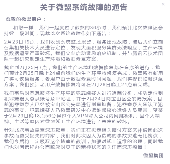 近日微盟官网发送一则故障通知,该通知称其公司业务系统数据库(包括主备)遭遇其公司运维人员的删除。据悉,目前犯罪嫌疑人已经被宝山区公安局进行刑事拘留,犯罪嫌疑人承认了犯罪的事实。犯罪嫌疑人乃微盟研发中心运维部核心运维人员贺某,贺某于2月23日晚18点56分通过个人VPN上网登入公司内网跳板机,因个人精神、生活等原因对微盟线上生产环境进行了恶意的破坏。
