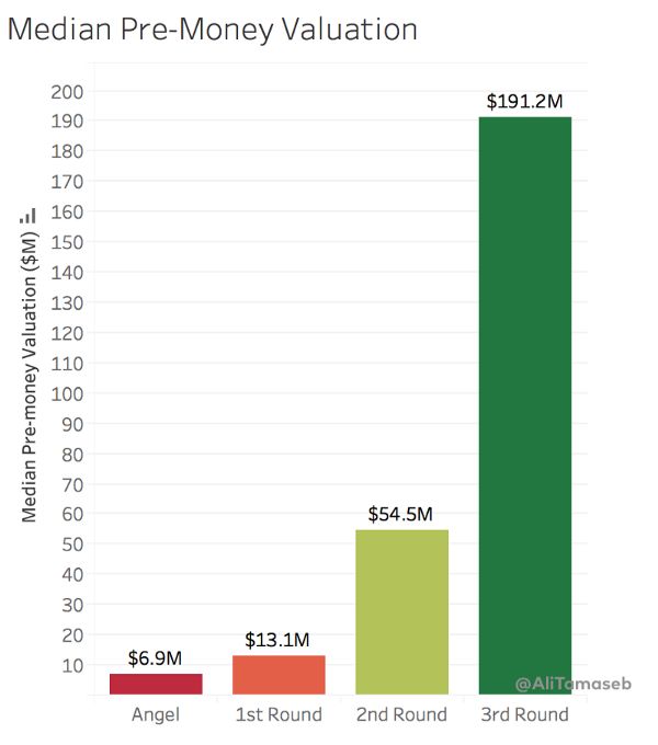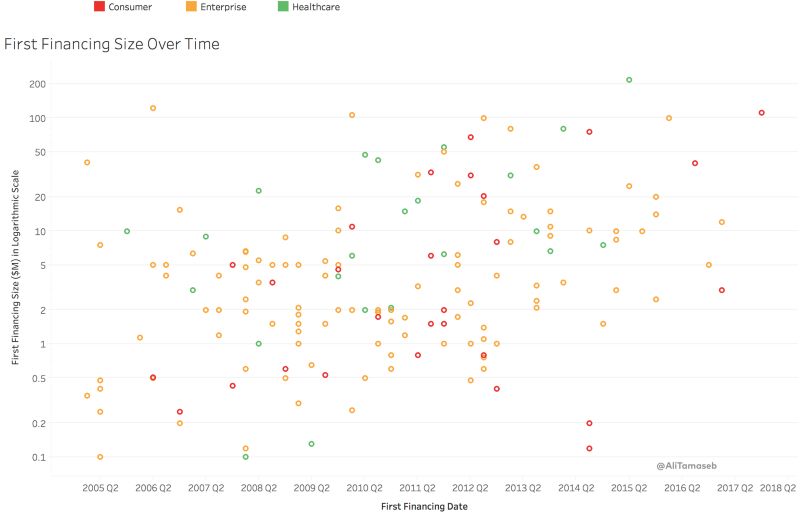 在过去的几年里,第一轮投资的规模有了明显的增长。下图使用对数计量。你可能会看到1000万美元以上的种子轮融资,这在初创公司中是相当罕见的,但是考虑到很多“十亿美元创业公司”创始人都是“超级创始人”——他们有能力筹集庞大的资金,这也是可以理解的。