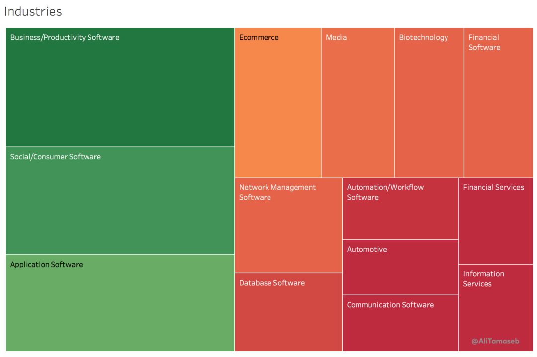 这些公司中的大部分是软件公司(包括服务即软件SaaS,网络等),其次是消费品公司(如服装品牌)和商业产品(实体产品,如3D打印机)以及医疗保健/制药公司。