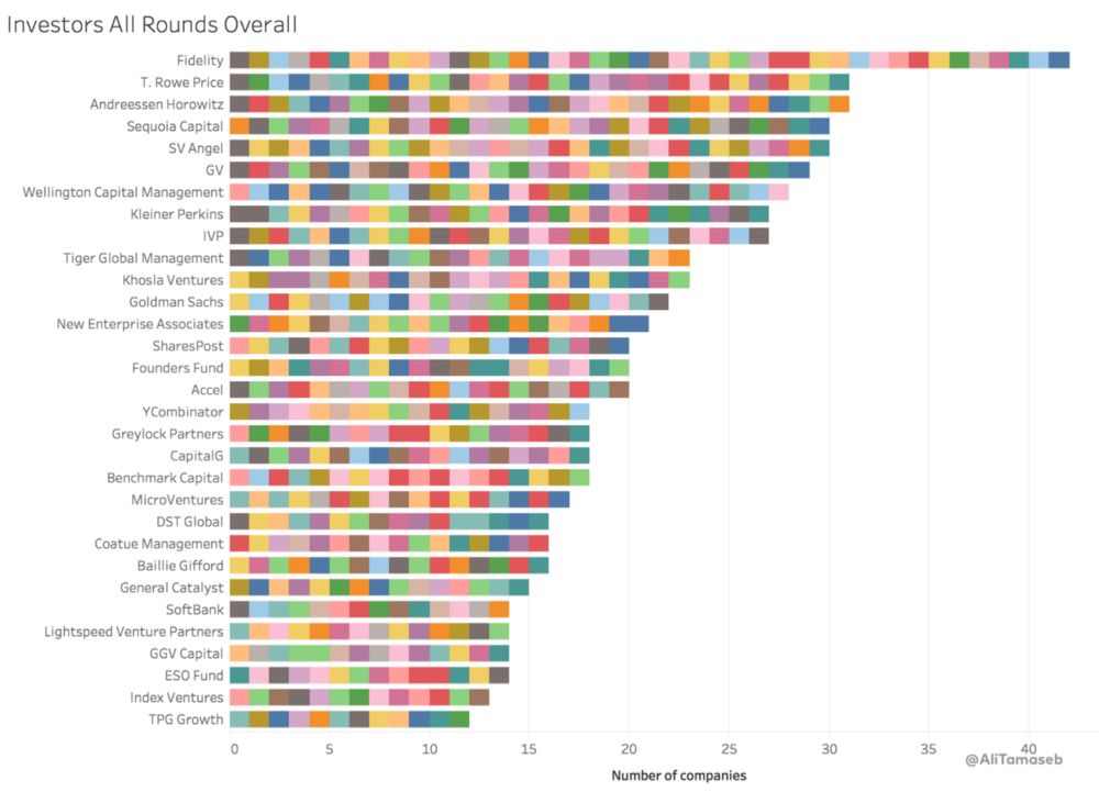 权衡所有的投资阶段(早期和后期),拥有更多资金的风投公司,可以选择在很多“十亿美元创业公司”的后期阶段进行投资(每次成功退出的回报更低,但是风险更小)。请注意,下面的数字完全来自于公开资料,可能会包含错误。