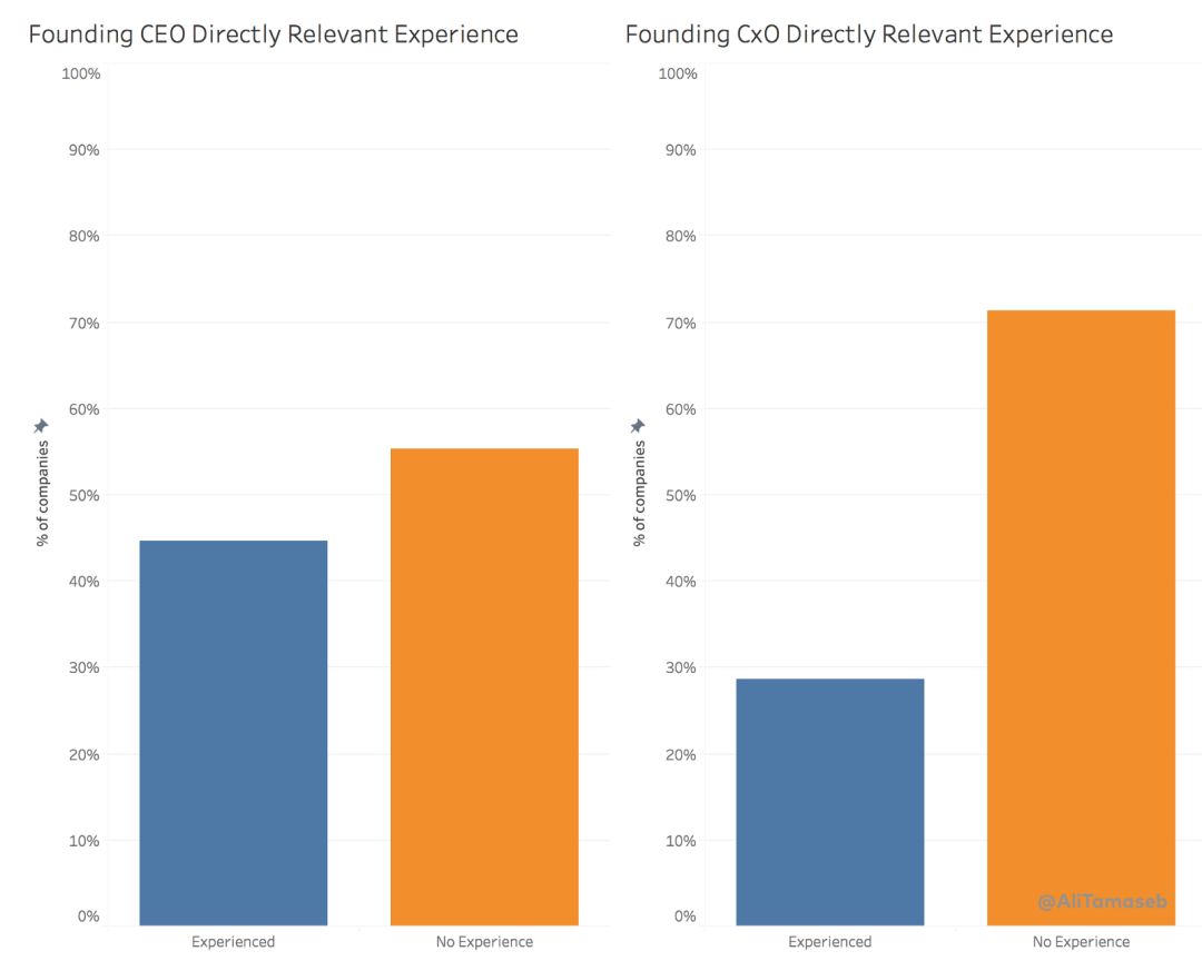 与普遍看法相反,大多数创始人在他们正在从事的行业中没有任何直接相关的工作经验。CEO和CxO之间也有明显的区别,行业经验与CxO的关联性更低。
