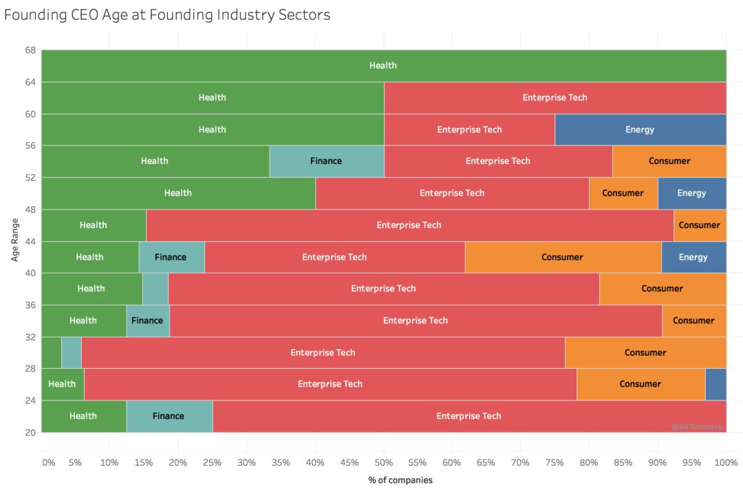 SaaS /企业创始人年轻,健康/制药创始人年龄较大,消费品行业创始人不仅仅是千禧一代