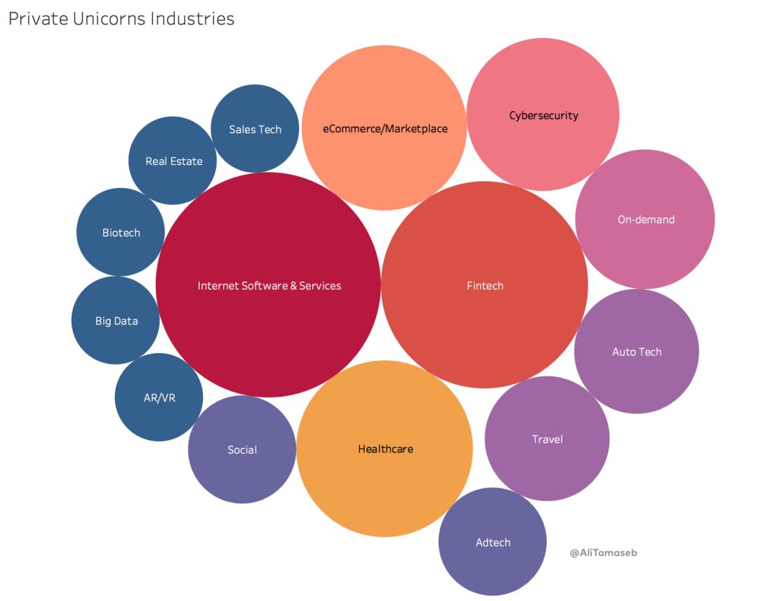 下图是2005年以后成立的私人独角兽(估值10亿美金以上的创业公司)公司中的佼佼者。其中一小部分是私营生物科技公司,绝大部分是私人软件和金融科技公司。
