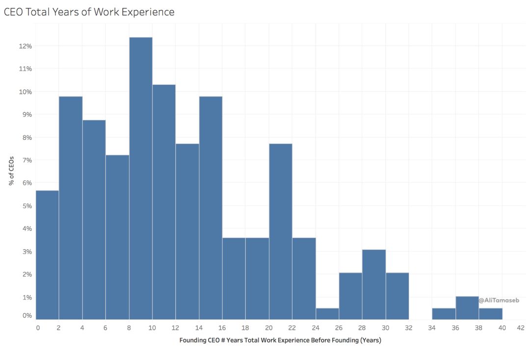一个常见误解是,每一个数十亿美元公司的创建都是从大学辍学开始的。名单中肯定有一些大学刚辍学的,但这些创始人事业开始起步的大部分时间都在24到36岁之间。