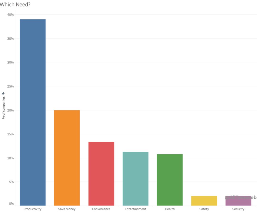 到目前为止,最重要的是生产力。我将生产力定义为产品或服务类别,其价值在于帮助公司或个人更快地实现目标,即节省时间。但是,在大多数情况下,节省时间意味着间接节省资金,而在企业业务中,需要用明确的投资回报率(ROI)来表明节省时间可以节省资金。其次是直接省钱,即你的解决方案直接比竞争对手花费更少的钱。