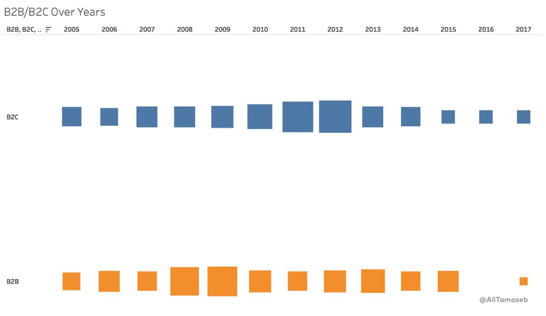 总体而言,B2B和B2C公司的数量差不多,2008-2009年间出现了更多的B2B独角兽公司,而2011-2012年度则是更多的B2C独角兽出现。