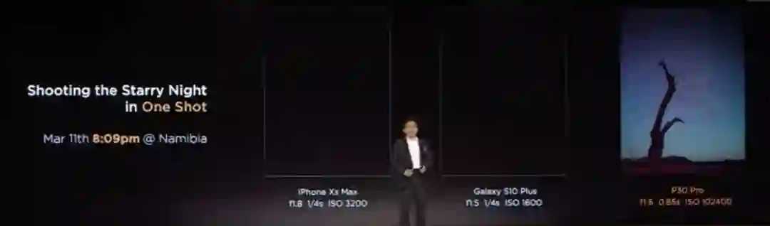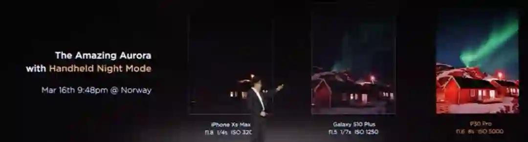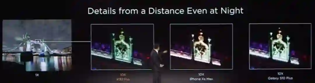 在暗光拍摄情况下,余承东先生展示了一系列P30 pro与iPhone XS Max与三星Galaxy S10 Plus所拍的照片对比图,结果你懂的,吊打友商。