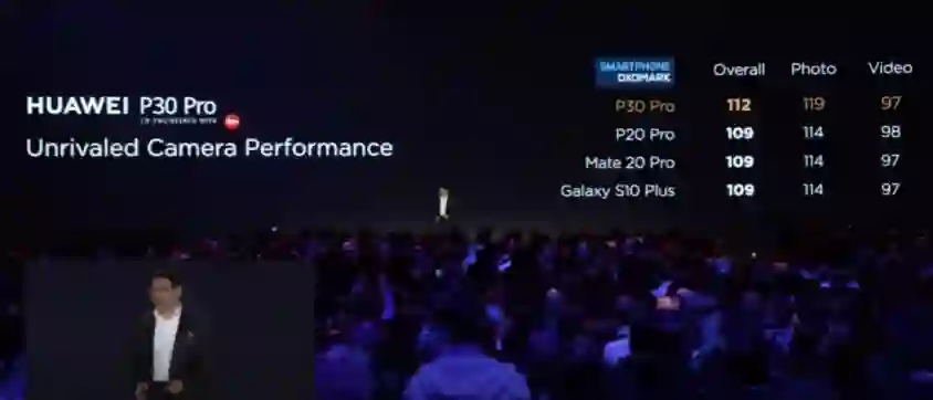 本次发布会上,余承东还介绍了华为系列手机在专业智能手机性能DXO测评的表现,P30 Pro超越P20系列。