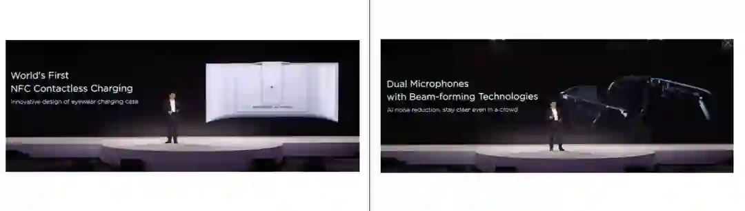 镜身上没有什么按钮,设计光滑,所有芯片、电池都内置,并且防水防尘。双麦克风设计,影院级立体声体验,可以用来接电话、听音乐、看视频。放正常声音也不会干扰到别人。并配备全球首款NFC不接触充电眼镜盒。简直是现实版黑客帝国同款眼镜啊!