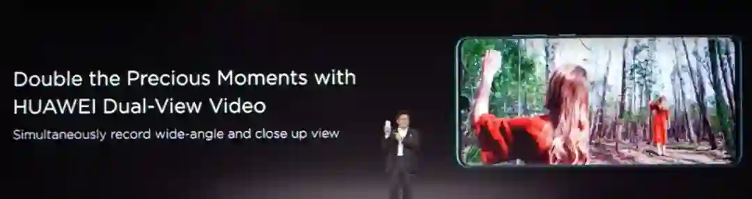 其次,华为P30系列手机还发布了一个非常有趣的摄像功能——双景摄像:同时设置广角和特写镜头。
