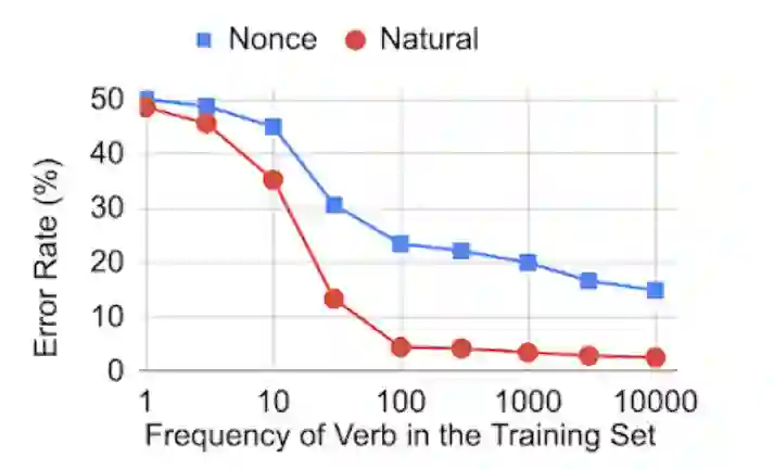 这些结果表明,虽然 BERT 能够对主谓一致规则进行建模,但它需要看到一个动词大约 100 次才能可靠地将它与规则一起使用。