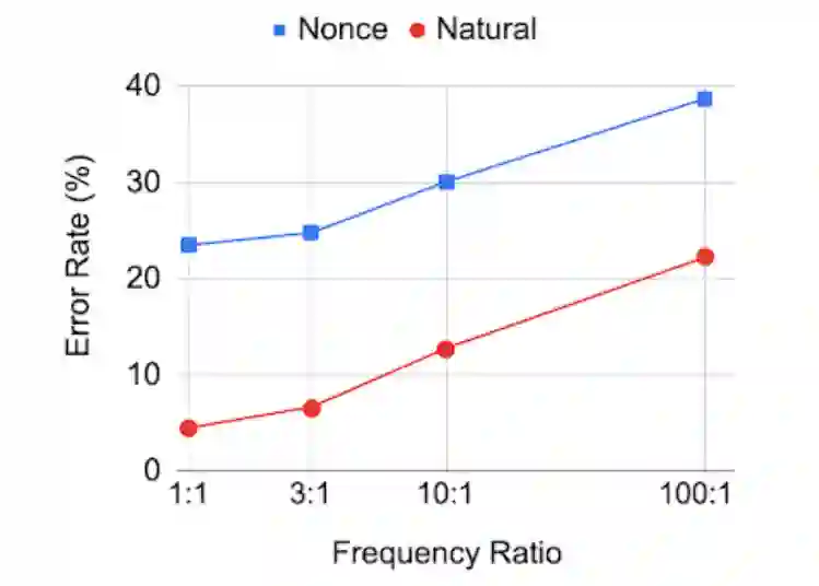 为了评估这个指标,再次使用相同的 60 个动词,但这次创建了预训练数据的改动版本,动词形式之间的频率比从 1:1 到 100:1 不等。下图显示了 BERT 在这些不同级别的频率不平衡下的性能: