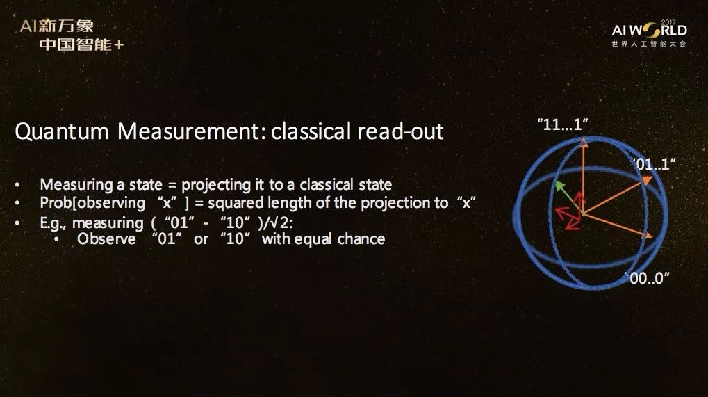 量子计算里面有个特别点,在如何读取数据上。量子存储跟经典的不同,因为人只能明白经典的信息,所以我们需要从量子状态里面读取经典的信息。读取时对应的数学操作是投影。在线性空间里,每一个向量可以分解成正交的子向量的和,每一个子向量对应一个经典的信息,这个维度是111,这个维度是000,那个可能是011。那么,N个量子比特,它的状态是个长度为1的向量,这个向量可以分解成几个子向量的和,每个子向量都沿着经典的信息方向,测量时你会随机观察到这些经典结果之中的一个,其概率就是这个经典结果对应的投影的长度平方。