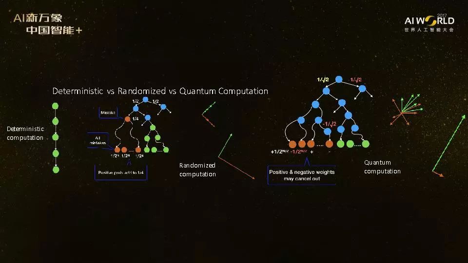 我现在做一个高层次的解释:为什么量子计算可能比经典计算快?下面我们来看确定性计算、随机计算和量子计算。确定性的计算很简单,从现在的状态开始, 再往下只有一个选择,所有的未来都是确定的。而随机计算你可以抛硬币,走不同的路径,50%概率可以走左边,50%的概率走右边,算法可以抛很多次硬币,走的路径也可以有很多很多。如果抛100次硬币,可能有2的100次方那么多的不同的计算路径。人们常说,量子计算的能力在于有大量不一样的路径,我觉得这样说太过简单,因为随机算法也可以有很多的路径。所以,有很多计算路径本身并不是量子计算更快的根本原因。