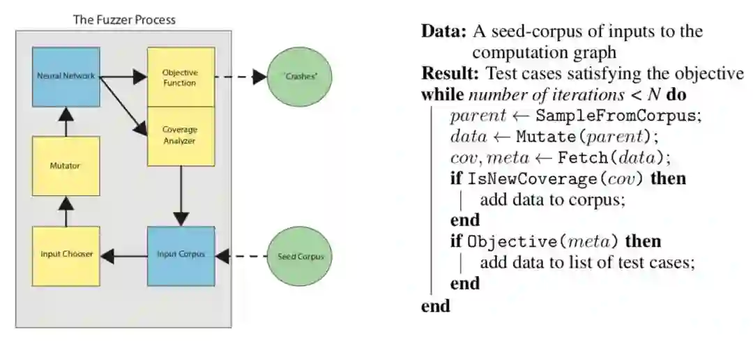 图一:模糊测试主流程的粗略描述。左侧为模糊测试的流程,并标示出了数据流;右侧为模糊测试主流程的算法表示。