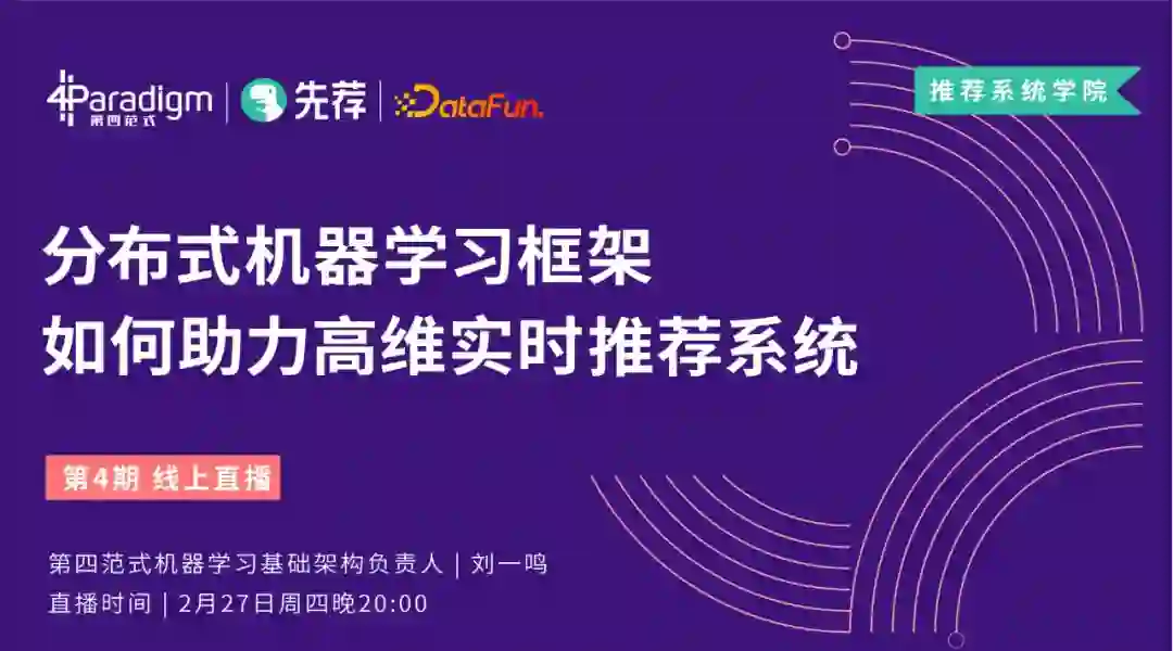 2月27日(周四)晚20点,DataFun联合第四范式|先荐举办线上直播,邀请来自第四范式机器学习基础架构负责人 | 刘一鸣,为大家分享 "分布式机器学习框架如何助力高维实时推荐系统"。