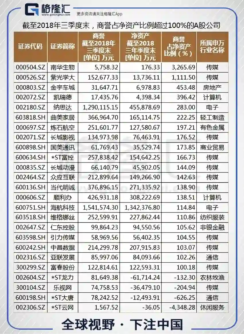 截至2018年三季度末,A股共有超过2070家上市公司存在商誉,商誉总额约为1.45万亿元,同比增长15%,环比增长4%。其中,约160家公司的商誉占净资产比例超过50%,21家超过100%。另外,像乐视网、*ST龙力等公司,它们的净资产为负,但商誉却高达数亿元。