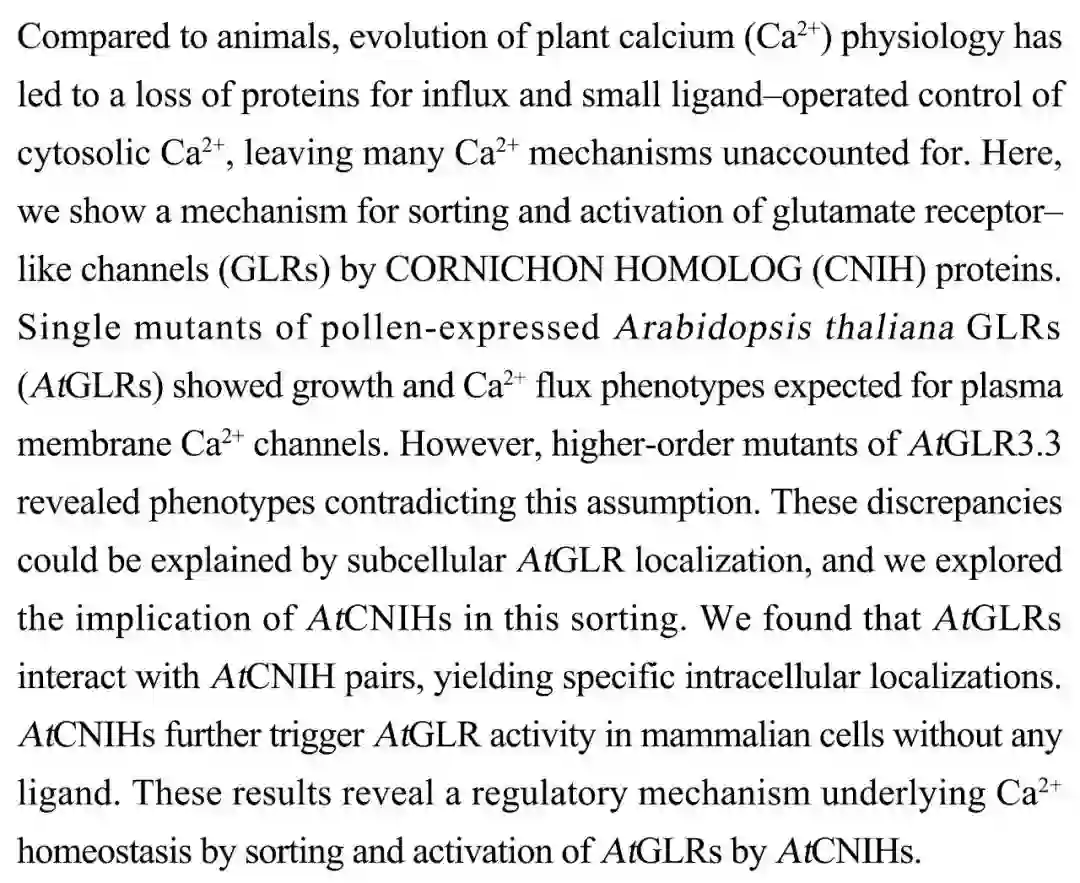 (导读 阿金)植物中负责 Ca2+ 流的蛋白质和小型配体门控机制均不知道。本研究发现拟南芥的谷氨酸受体样通道(AtGLRs)与其 CNIH 蛋白(AtCNIH)相结合,产生特定的细胞间定位。而 AtCNIH 无需配体便可激活 AtGLR,对其进行分选,从而调节 Ca2+ 的动态平衡。