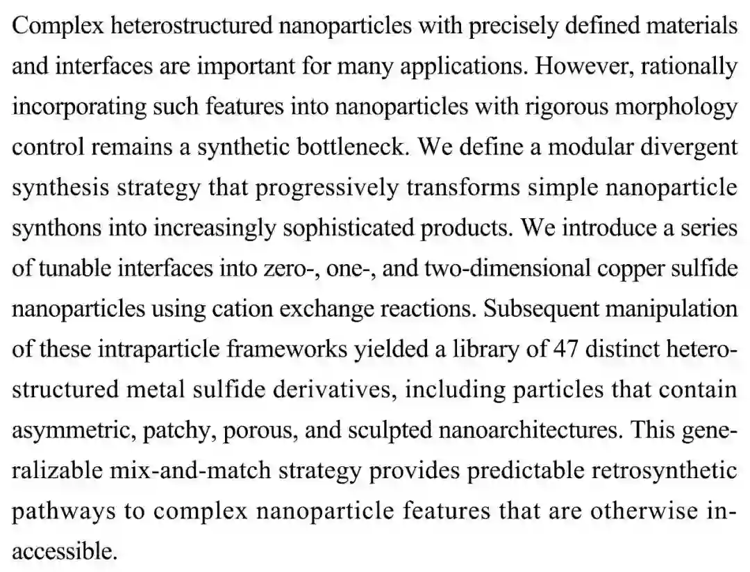 (导读 卓思琪)复杂异质结构纳米粒子的严格形态学控制是合成难点。本文提出了一个模块化发散合成策略,可以从简单的纳米粒子出发逐步合成复杂产物。研究者使用阳离子交换反应向硫化铜纳米颗粒中引入可调界面,继而利用形成的粒子内框架合成了 47 种具有不同形态特征的金属硫化衍生物异质结构。该策略为复杂纳米粒子的合成提供了可预测的逆合成途径。