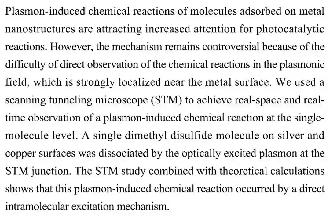 (导读 卓思琪)等离子诱导下发生的吸附于金属纳米结构表面的化学反应在光催化领域大有前景,但对等离子环境下化学反应的直接观测存在困难。本研究利用扫描隧道显微镜(STM)实现了等离子诱导化学反应在单分子水平上的实时、实空间观测。结合 STM 研究和理论计算,表明该等离子诱导化学反应是直接通过分子内激发机制发生的。