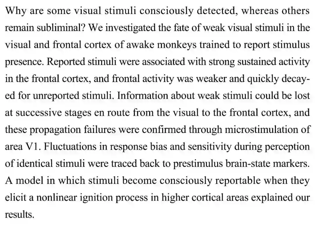 (导读 胡琦琳)本研究探究清醒的猴子视觉和额叶中弱刺激的归宿,这些经过训练的猴子能报告刺激的存在。研究表明刺激与额叶中持续强活动有关。报告的刺激信息可能在从视觉传输到额叶的过程中丢失,而这样的传输失败是通过 V1 区域的微刺激确认。当刺激在更高的皮质引发非线性激发过程时,便可以被有意识的报告。