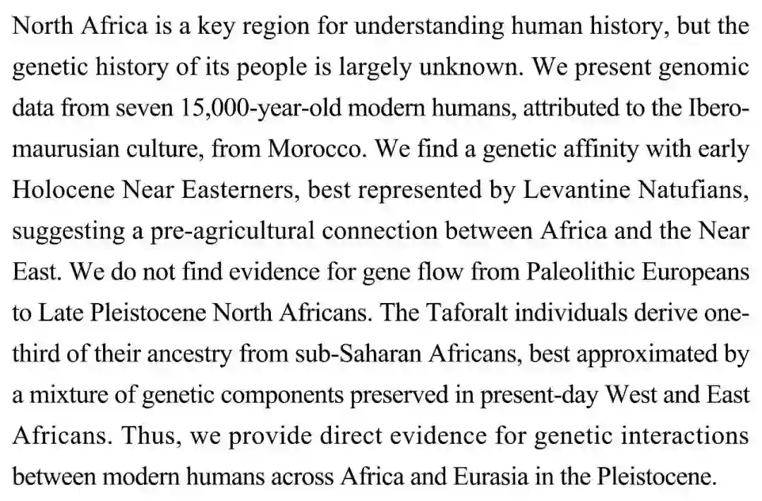 (导读 郭思瑶)北非人类的遗传历史尚不清楚。本文对 1.5 万年前摩洛哥伊比利亚莫鲁斯文化时期的人类骨骼进行基因组测序,发现其与全新世早期近东人具遗传亲和性,暗示非洲与近东在农业时期前已有联系,Taforalt 人 1/3 的祖先源自撒哈拉以南非洲。这为更新世非洲与欧亚大陆的人类联系提供了直接证据。